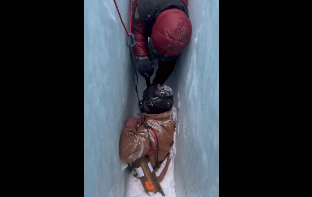 Το βίντεο τραβήχτηκε από διασώστες και δημοσιεύτηκε στο TikTok δείχνει το τεράστιο βάθος στο οποίο εγκλωβίστηκε ο ορειβάτης, ενώ ήταν καλυμμένος μέχρι τη μέση με χιόνι.