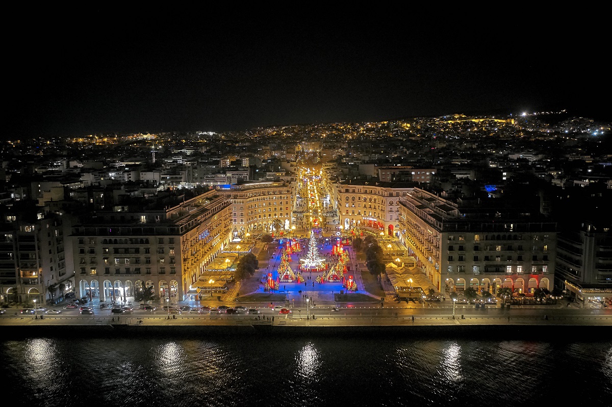 Στην πλατεία και στον άξονα της Αριστοτέλους έχει αρχίσει να διαμορφώνεται ένα μαγικό γιορτινό σκηνικό. Το κεντρικό δέντρο που κοσμεί την πλατεία ταξίδεψε στη Θεσσαλονίκη από τον Ταξιάρχη της Χαλκιδικής. Είναι ύψους 18 μέτρων και φωτίζεται με περίπου 50.000 λαμπιόνια led.