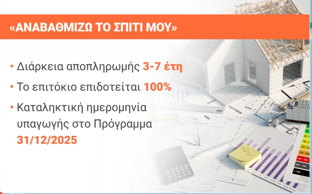 Το πρόγραμμα «Αναβαθμίζω το σπίτι μου» προσφέρει άτοκο δάνειο για ανακαινίσεις κατοικιών, με στόχο τη βελτίωση της ενεργειακής απόδοσης. Πρόκειται για μια σημαντική ευκαιρία για τους ιδιοκτήτες ακινήτων που επιθυμούν να αναβαθμίσουν το σπίτι τους χωρίς να επιβαρυνθούν με υψηλά επιτόκια. Για το πρόγραμμα που έχει καταληκτική ημερομηνία υπαγωγής την 31η Δεκεμβρίου μίλησε o φοροτεχνικός Σπύρος Σταυρούλιας.