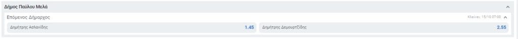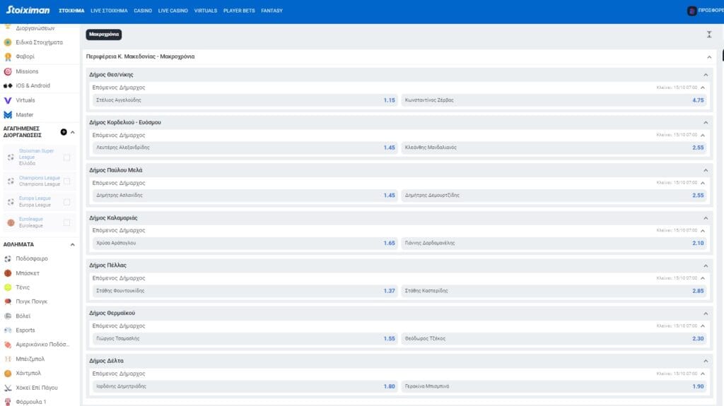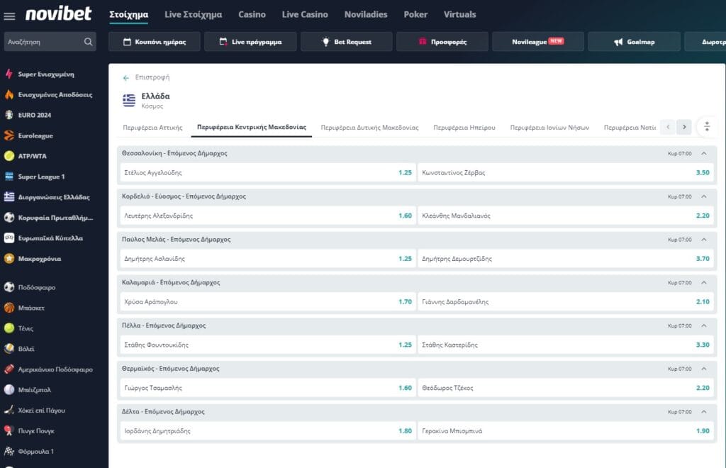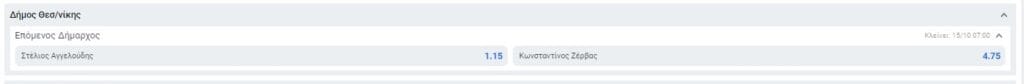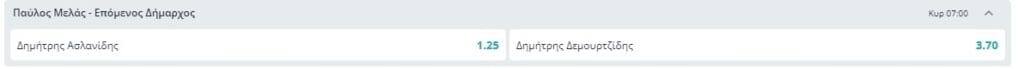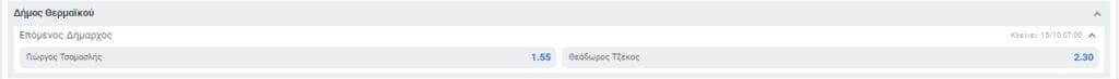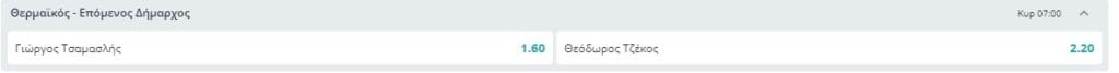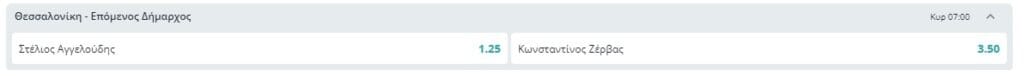 Σε ό,τι αφορά στον Δήμο Θεσσαλονίκης, τόσο η Stoiximan όσο και η Novibet βλέπουν εκλογή του Στέλιου Αγγελούδη. Ειδικότερα, η Stoiximan του δίνει 1,15, ενώ η Novibet 1,25. Σε ό,τι αφορά στον νυν δήμαρχο, Κωνσταντίνο Ζέρβα, η Stoiximan του δίνει 4,75 και η Novibet 3,50.