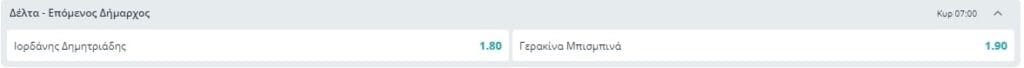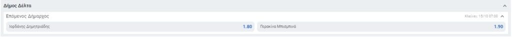 Σε απόλυτο ντέρμπι εξελίσσεται η “μάχη” για τον δημαρχιακό θώκο στον Δήμο Δέλτα, σύμφωνα με τις αποδόσεις των στοιχηματικών εταιρειών. Τόσο η Stoiximan όσο και η Novibet δίνουν απόδοση 1,80 στον Ιορδάνη Δημητριάδη και 1,90 στη Γερακίνα Μπισμπινά. Ντέρμπι για γερά νεύρα!