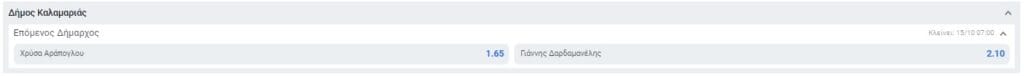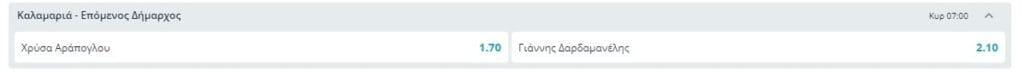 Στον Δήμο Καλαμαριάς, οι στοιχηματικές εταιρείες δίνουν προβάδισμα στη Χρύσα Αράπογλου έναντι του νυν δημάρχου και εκ νέου υποψήφιου, Γιάννη Δαρδαμανέλη. Η Χρύσα Αράπογλου έχει απόδοση 1,65 στη Stoiximan και 1,70 στη Novibet, ενώ ο Γιάννης Δαρδαμανέλης στη Stoiximan έχει 2,10 και στη Novibet 2,10.