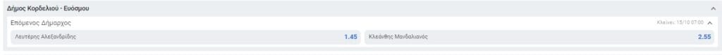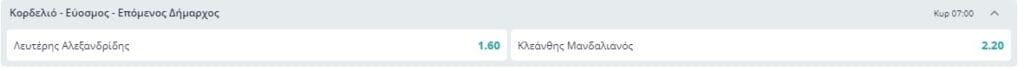 Προβάδισμα στον Λευτέρη Αλεξανδρίδη για να είναι ο νικητής το βράδυ της Κυριακής δίνουν οι στοιχηματικές εταιρείες. Ειδικότερα, η Stoiximan δίνει στον κ. Αλεξανδρίδη 1,45, ενώ στον νυν δήμαρχο, Κλεάνθη Μανδαλιανό, 2,55. Ανάλογη η εικόνα για τους δυο “μονομάχους” του Δήμου Κορδελιού – Ευόσμου και στη Novibet, δίνοντας 1,60 απόδοση στον Λευτέρη Αλεξανδρίδη και 2,20 στον Κλεάνθη Μανδαλιανό.
