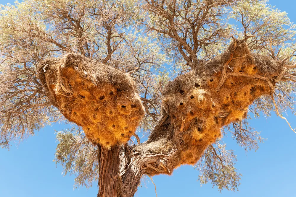 Οι κοινωνικοί υφαντές (sociable weavers) είναι κάτι πουλιά από την Αφρική που χτίζουν φωλιές που από μακριά μοιάζουν σαν τεράστια δεμάτια σανό που έχουν πέσει πάνω στο δέντρο. Χρησιμοποιούν πολλά διαφορετικά υλικά για να κατασκευάσουν τις πολυκατοικίες τους. Φτιάχνουν τη βασική δομή με μεγαλύτερα ξύλα, και δημιουργούν τα όρια ανάμεσα στα ξεχωριστά δωμάτια με ξερά χορτάρια. Στη συνέχεια, καλύπτουν κάθε δωμάτιο της φωλιάς με πιο μαλακά χορτάρια και ίνες.