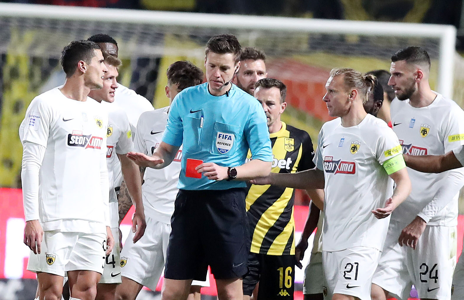 Στο 58΄ η ΑΕΚ έμενε με δέκα παίκτες λόγω της απευθείας κόκκινης κάρτας που δέχθηκε ο Μήτογλου για σκληρό φάουλ πάνω στον Μορόν. Το VAR κάλεσε τον διαιτητή να δει τη φάση και μετά από έλεγχο δεν άλλαξε την απόφασή του, προκαλώντας τις διαμαρτυρίες των φιλοξενούμενων, καθώς θεώρησαν ότι στην αρχή της φάσης υπήρχε χέρι, αλλά το ριπλέι τους διαψεύδει κατηγορηματικά.