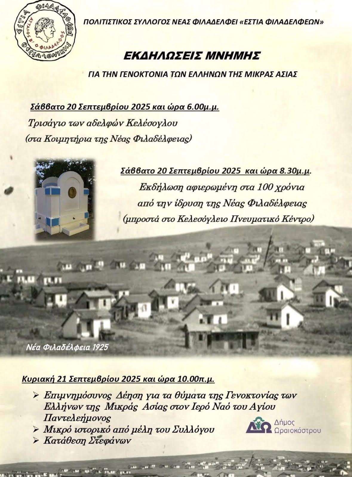 Σάββατο, 20 Σεπτεμβρίου 2025, 20.30, Εκδήλωση αφιερωμένη στη συμπλήρωση 100 χρόνων από την ίδρυση της Νέας Φιλαδέλφειας, στο χώρο μπροστά από το Κελεσόγλειο Πνευματικό Κέντρο.