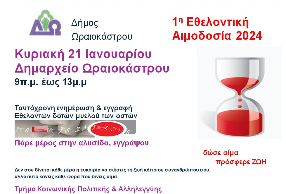 Δ. Ωραιοκάστρου: 21 Ιανουαρίου η πρώτη εθελοντική αιμοδοσία για το 2024 με ταυτόχρονη ενημέρωση-εγγραφή εθελοντών δοτών μυελού των οστών