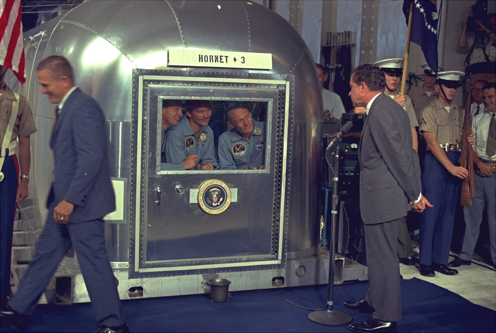 Αποτελεί άλλωστε μέρος της λαμπρής ιστορίας του διαστήματος, η φωτογραφία των τριών αστροναυτών μέσα στην αμπούλα απομόνωσης, να χαιρετούν τον τότε πρόεδρο των ΗΠΑ, Ρίτσαρντ Νίξον.