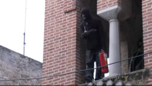 Οι δύο κουκουλοφόροι που φέρονται ότι διέρρηξαν το κατάστημα και έβαλαν τη φωτιά, έχουν ανέβει επάνω στην εκκλησία του Αγίου Μηνά και πετάνε αντικείμενα στους αστυνομικούς. Ένας από τους δύο χτύπησε και την καμπάνα.