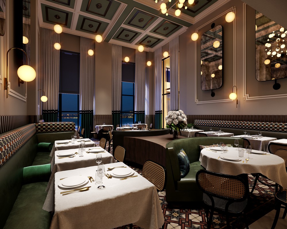 Η ρεσεψιόν σχεδιάστηκε με έμπνευση από τη δεκαετία του ‘50, αξιοποιώντας άφθονα στοιχεία από βελούδο, ξύλο και ορείχαλκο. Στο κεντρικό εστιατόριο, χώρο που συνδέεται στενότερα με την ιστορία του κτιρίου, οι υφές, τα φωτιστικά από μπρούντζο και φυσητό γυαλί, αλλά και τα έπιπλα κινούνται σε art deco ρυθμούς. Η παλέτα είναι σε γκρι και μπλε, χρώματα σήμα- κατατεθέν του ιστορικού εστιατορίου, ενώ οι περίφημες καρέκλες μπιστρό που υπήρχαν κάποτε εδώ επανασχεδιάστηκαν για περισσότερη άνεση.