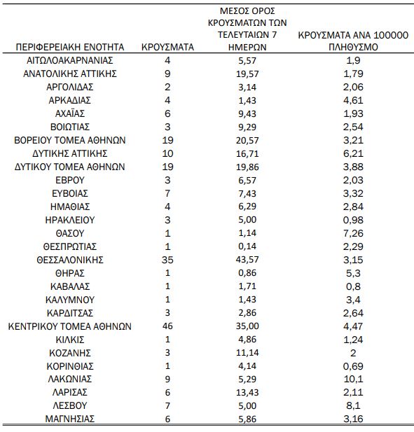 Η κατανομή των κρουσμάτων ανά περιφερειακή ενότητα: