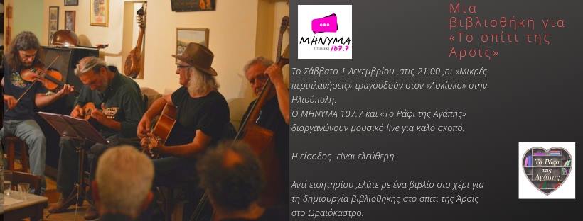 Το Σάββατο 1 Δεκεμβρίου διοργανώνεται μουσικό live για καλό σκοπό, με ελεύθερη είσοδο.Αντί για εισητηρίου θα έχουμε όλοι ένα βιβλίο στο χέρι για τη δημιουργία βιβλιοθήκης στο σπίτι της ΑΡΣΙΣ στο Ωραιόκαστρο.