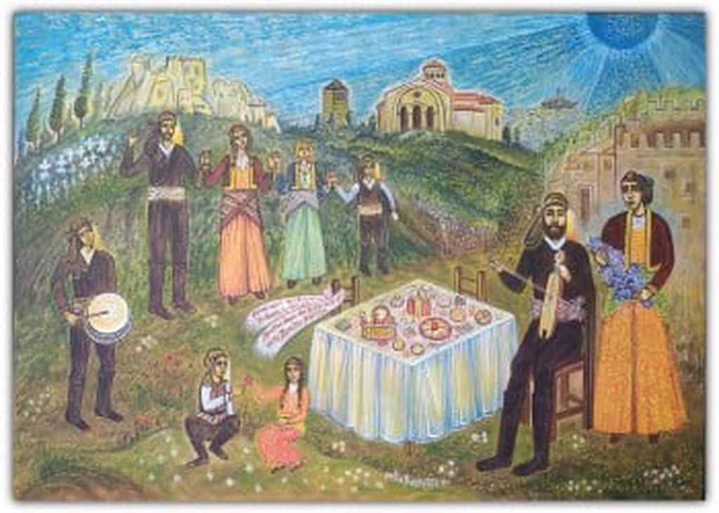 Να μας ζήσει! Φωνάξαμε όλοι κι εκείνος συγκινημένος πλησίασε τον Στυλιανό και κόλλησε στο μέτωπό του ένα μετζίτι (20 γρόσια). Μπήκαμε στο δωμάτιο της υποδοχής. Εκεί γύρω σε πλούσια στολισμένο τραπέζι, καθόταν μερικοί συνάδελφοι του Μιανιά και ο Γ. Κασιμίδης (Κιαμήλ αγάς). Ανταλλάξαμε χαιρετισμό Ρωμαίικα και Τούρκικα και καθίσαμε. Το φαγοπότι σε ένταση και το γλέντι άναψε και κόρωσε. Η λύρα με τη μελωδία της έθελγε όλους και τα διαλεχτά και επίκαιρα τραγούδια τόνωσαν την διάθεση των γλεντζέδων.