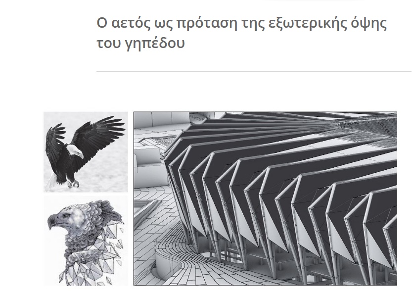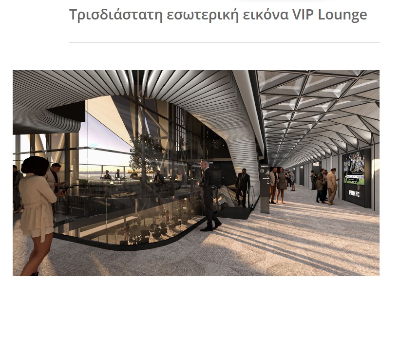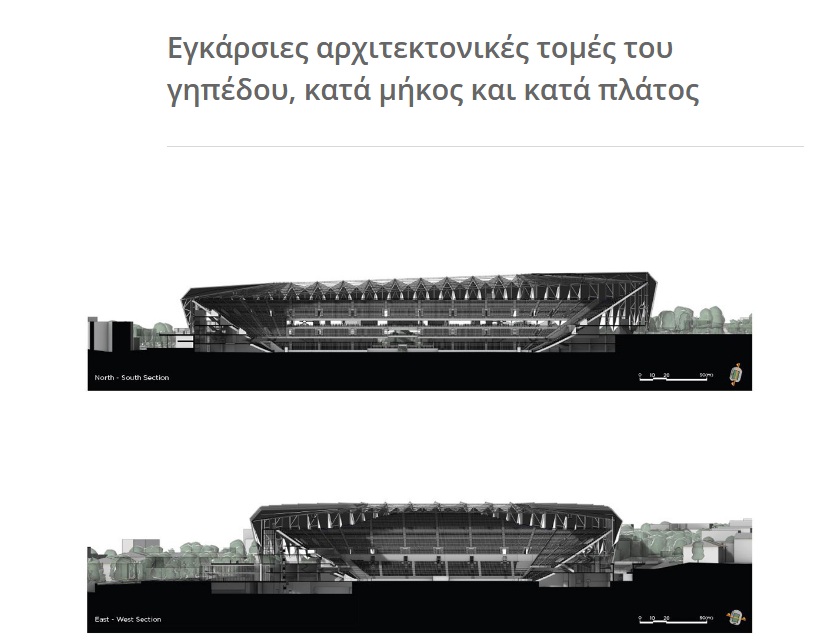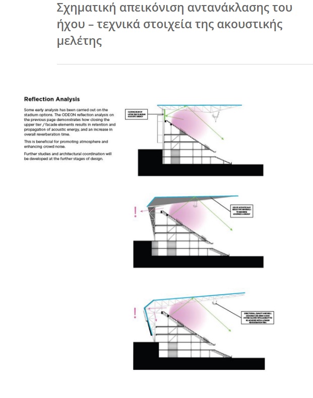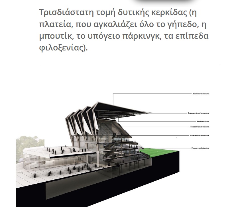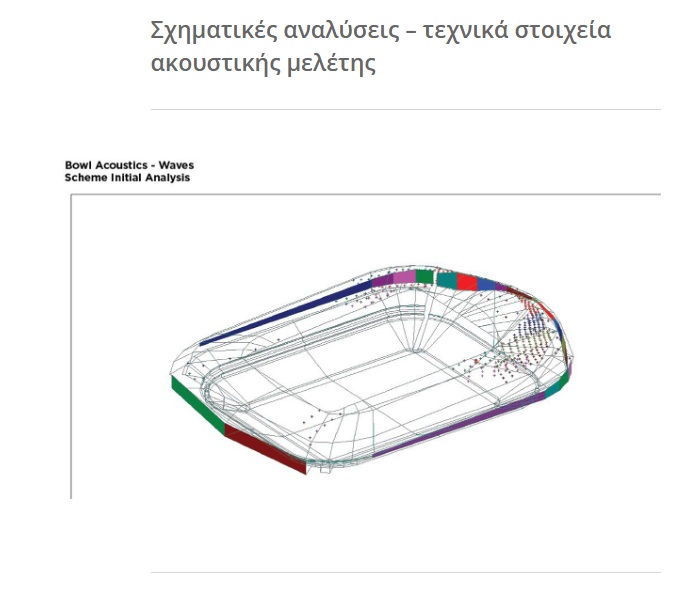 Ειδικότερα, σημεία προσέλευσης, χώροι στάθμευσης, στέγαστρα, όψεις, κερκίδες, σε συνδυασμό με τις απαιτούμενες ειδικές μελέτες (εκκένωση χώρων, συστημάτων επικοινωνίας κ.α.), προκειμένου να καλύπτουν τους στόχους για μια υπερσύγχρονη εγκατάσταση.