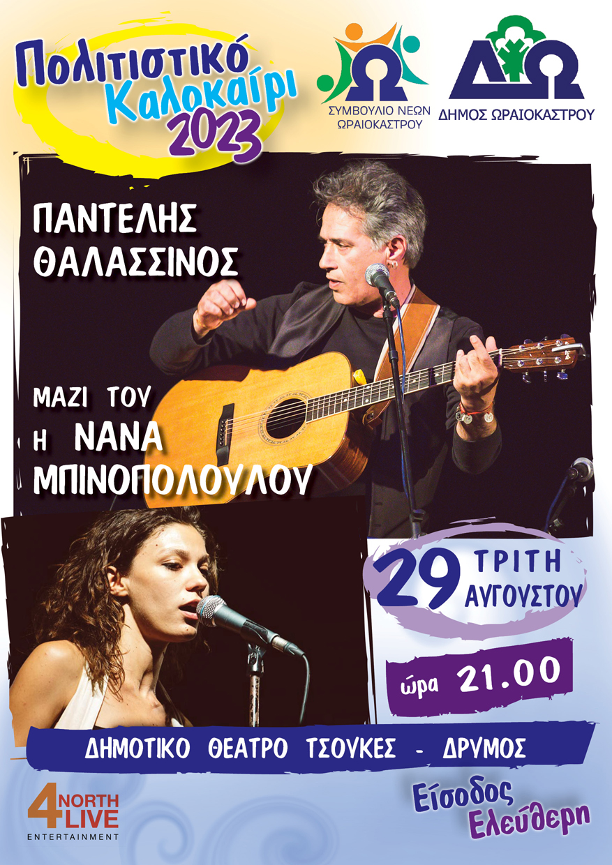 Με συναυλία του Παντελή Θαλασσινού και της Νανάς Μπινοπούλου συνεχίζεται το «Πολιτιστικό Καλοκαίρι 2023» του Δήμου Ωραιοκάστρου. Η εκδήλωση θα πραγματοποιηθεί την Τρίτη, 29 Αυγούστου 2023, στις 21.00 στο Δημοτικό Θέατρο «Τσούκες» στο Δρυμό με ελεύθερη είσοδο για το κοινό.
