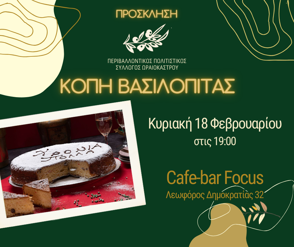 Το ΔΣ του Περιβαλλοντικού Πολιτιστικού Συλλόγου Ωραιοκάστρου σας προσκαλεί στην κοπή βασιλόπιτας που θα πραγματοποιηθεί την ερχόμενη Κυριακή στο cafe-bar Focus με την παράκληση να την κοινοποιήσετε στον διαδικτυακό σας χώρο.