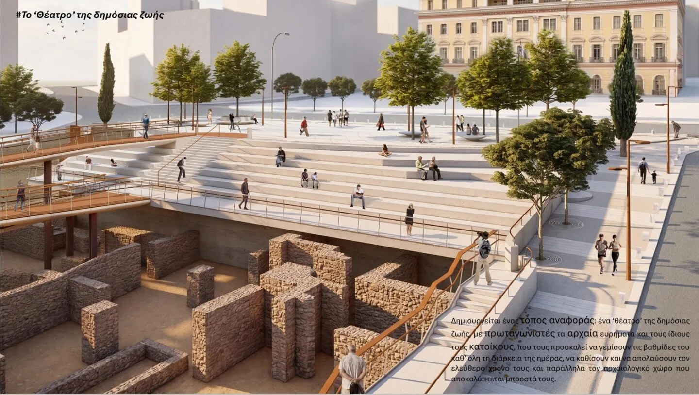 Στον κεντρικό πυρήνα της πρότασης βρίσκεται η συνύπαρξη αρχαιολογικού χώρου και δημόσιας πλατείας μέσα από δύο συμβολικούς αρχιτεκτονικούς χειρισμούς, το «θέατρο» και την «πασαρέλα».