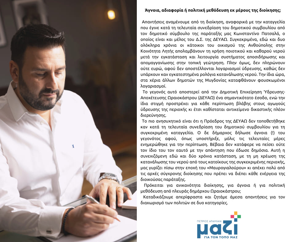 Απαντήσεις αναμένουμε από τη διοίκηση, αναφορικά με την καταγγελία που έγινε κατά τη τελευταία συνεδρίαση του δημοτικού συμβουλίου από τον δημοτικό σύμβουλο της παράταξής μας Κωνσταντίνο Πατσαλά, ο οποίος είναι και μέλος του Δ.Σ. της ΔΕΥΑΩ. Συγκεκριμένα, εδώ και δυο ολόκληρα χρόνια οι κάτοικοι του οικισμού της Ανθούπολης στην Κοινότητα Λητής απολαμβάνουν τη χρήση ποιοτικού και καθαρού νερού μετά την εγκατάσταση και λειτουργία συστήματος αποσιδήρωσης και απομαγγανίωσης στην τοπική γεώτρηση. Πλην όμως, δεν πληρώνουν ούτε ευρώ, αφού δεν αποστέλλονται λογαριασμοί ύδρευσης, καθώς δεν υπάρχουν καν εγκατεστημένα ρολόγια κατανάλωσης νερού. Την ίδια ώρα, στα χέρια άλλων δημοτών της Μυγδονίας καταφθάνουν φουσκωμένοι λογαριασμοί.