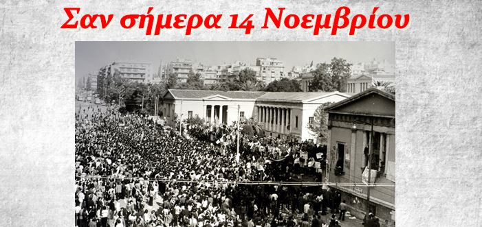 1973: Αρχίζουν στο Πολυτεχνείο γενικές συνελεύσεις των φοιτητών. Στο προαύλιο εκατοντάδες φοιτητές φωνάζουν αντιδικτατορικά συνθήματα. Η Αστυνομία περικυκλώνει το κτίριο. Οι φοιτητές που μετείχαν στην παμφοιτητική συγκέντρωση στη Νομική μεταβαίνουν στο Πολυτεχνείο. Το βράδυ συγκροτείται η πρώτη Συντονιστική Επιτροπή και οργανώνεται η κατάληψη.