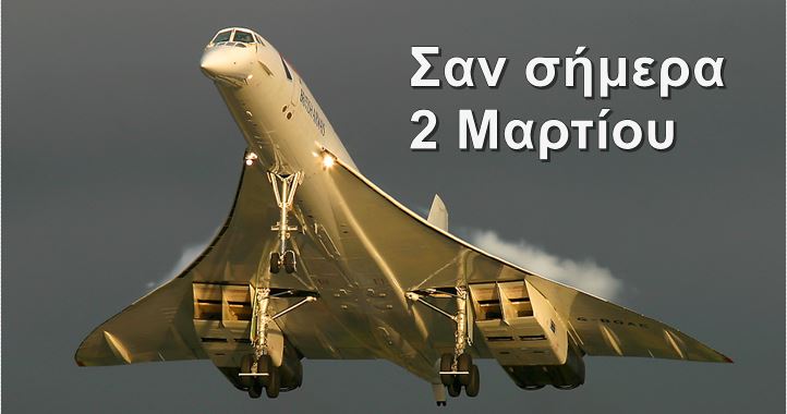 1969: Πραγματοποιείται η πρώτη πτήση του Concorde, με το γαλλικό πρωτότυπο 001 (F-WTSS) στην Τουλούζη της Γαλλίας.