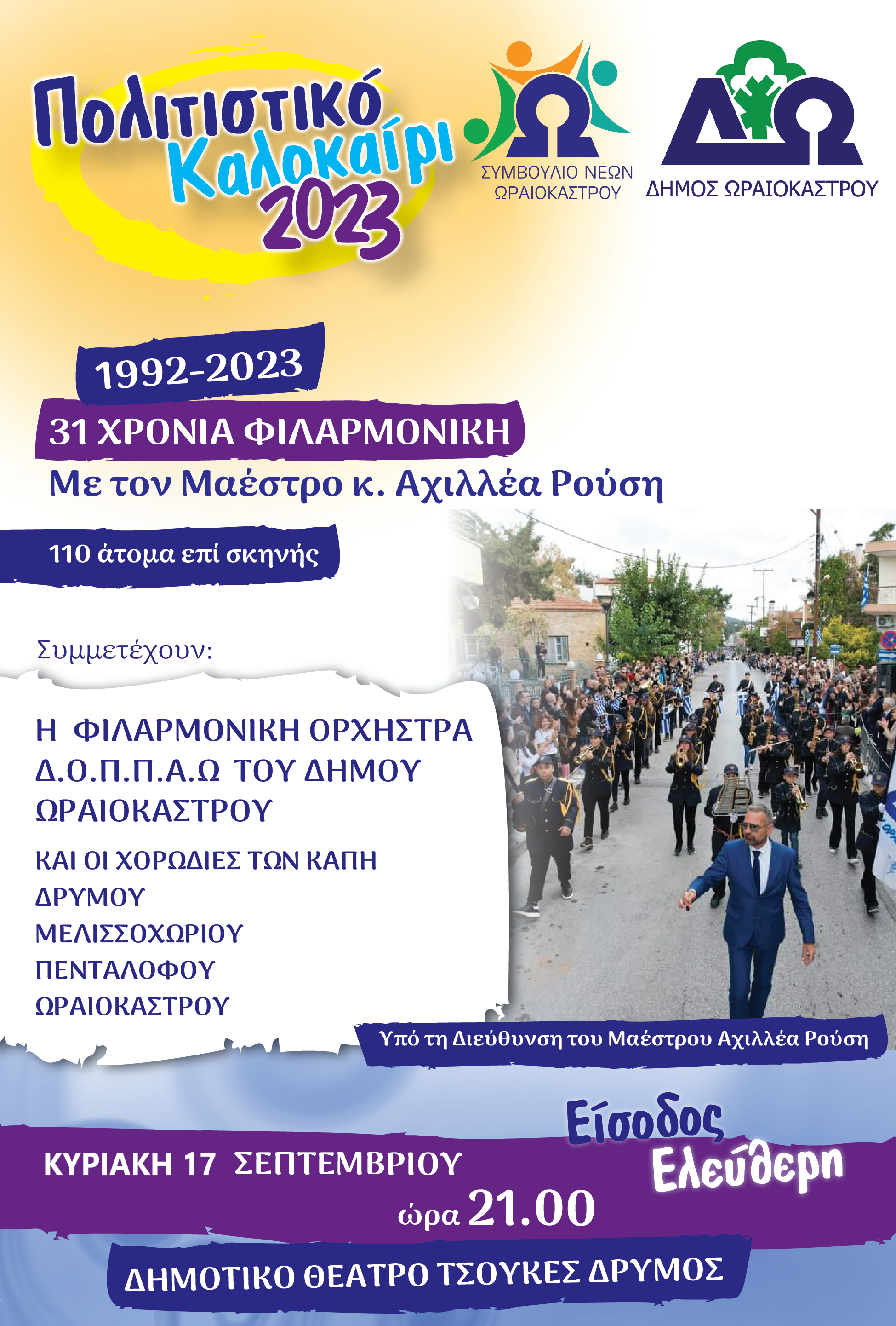 Η συναυλία θα δοθεί υπό την διεύθυνση του Αχιλλέα Ρούση, που συμπληρώνει ως μαέστρος 31 χρόνια στη Φιλαρμονική Ορχήστρα του Δήμου Ωραιοκάστρου.