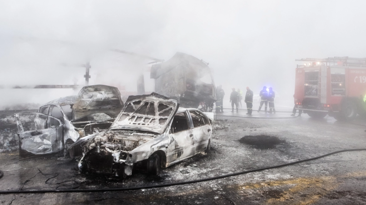 Τα αυτοκίνητα και η νταλίκα κάηκαν ολοσχερώς και έχουν μείνει μόνοι οι σκελετοί ενώ διαλύθηκε και το κουβούκλιο των διοδίων: