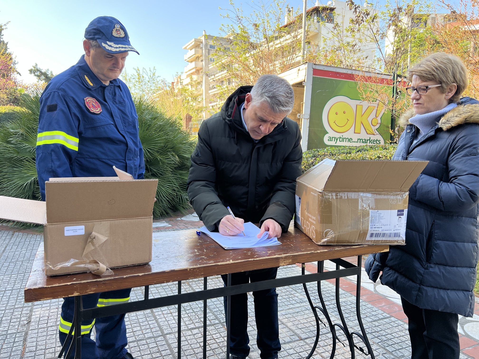 Υλικό και είδη που είναι απαραίτητα σε καταστάσεις έκτακτης ανάγκης για την υποστήριξη των πολιτών, καθώς και των γυναικών και των ανδρών του Πυροσβεστικού Σώματος που επιχειρούν υπό ακραίες συνθήκες για την αντιμετώπιση κρίσεων και φυσικών καταστροφών, παρέδωσε ο Αντιπεριφερειάρχης Θεσσαλονίκης, Κώστας Γιουτίκας, στην Πυροσβεστική Υπηρεσία Θεσσαλονίκης.